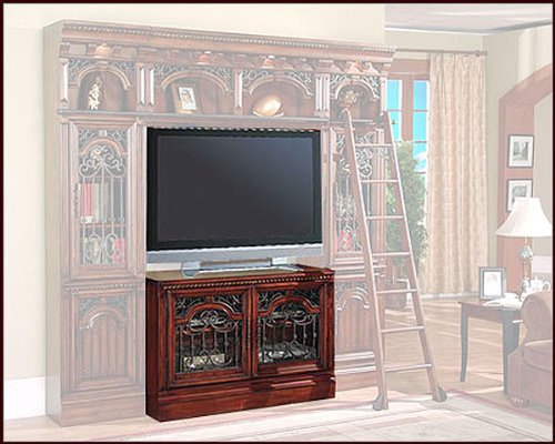 A multi-functional Home Entertainment Center, Home Office, & Bookcase Wall in Spanish Revival style. Lighting on front beautifully accents literature and all display items. Offers 2 console choices for a better custom fit around your television. All main pieces feature interlocking rail system for our Library Ladder. Dark red walnut stain with hand wiped overglaze. Cast metal (Zinc) door grills and metal accents, with hammered nail head accents in panels.